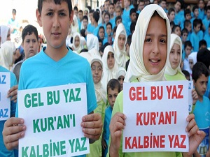 Kur'an kursu açılışını öğrenciler, "Gel Bu Yaz Kuran'ı Kalbine Yaz-Haydi Çocuklar Kuran öğrenmeye" diyerek karşıladılar.