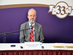 “İnsan niçin yaratıldı?” sorusunun Kur’ân’daki cevabını yorumlayarak sözlerine başlayan Prof. Dr. Rami Yaran, Allah’ın kullarını kendini bilmeleri ve tanımaları için yarattığını, bu tanımanın “Rabb tanıma” şeklinde anlaşılması gerektiğini vurguladı. Kulluk kelimesine yüklenen olumsuz anlamların son derece yanlış olduğunu belirten Rahmi Yaran, “Kulluk, insanın Rabb’i karşısındaki konumudur. Yoksa bir başka insanın karşısındaki kulluk durumu, dinimizde ve kültürümüzde olmayan bir şeydir. Cenab-ı Hakk insanı yarattı ancak onu başıboş bırakmayıp hep yol gösterdi. Kitaplar ve peygamberler gönderdi.” diyerek kitabın ve peygamberin insanın yaradılışından bu yana varolduğunu hatırlattı. Peygamberimizin âlemlere rahmet olarak gönderildiğinin Kur’ân’da sabit olduğunu söyleyen İstanbul Müftüsü Rahmi Yaran, bu girişten sonra sözlerini şöyle sürdürdü: