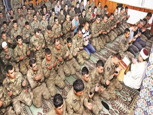Ailelerinden uzak olmanın burukluğunu yaşayan askerler, bayramın 1.günü sabahın ilk ışıklarıyla tugay komutanlığı içinde bulunan mescidi doldurdu.