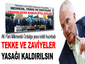 AK Parti Ankara Milletvekili Haluk Özdalga, tekke ve zaviyelerle ilgili yasanın yürürlükten kaldırılması için yasa teklifi hazırladığını söyledi. Özdalga, düzenlediği basın toplantısında, kanun teklifiyle ilgili bilgi verdi.