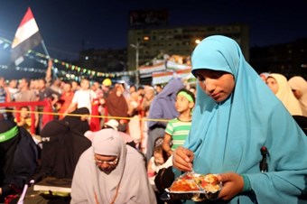 Mısır’da Rabiatu'l-Adeviye Meydanı’nda bulunan on binlerce Mursi taraftarı, Ramazan ayının ilk iftarını meydanda açtı.